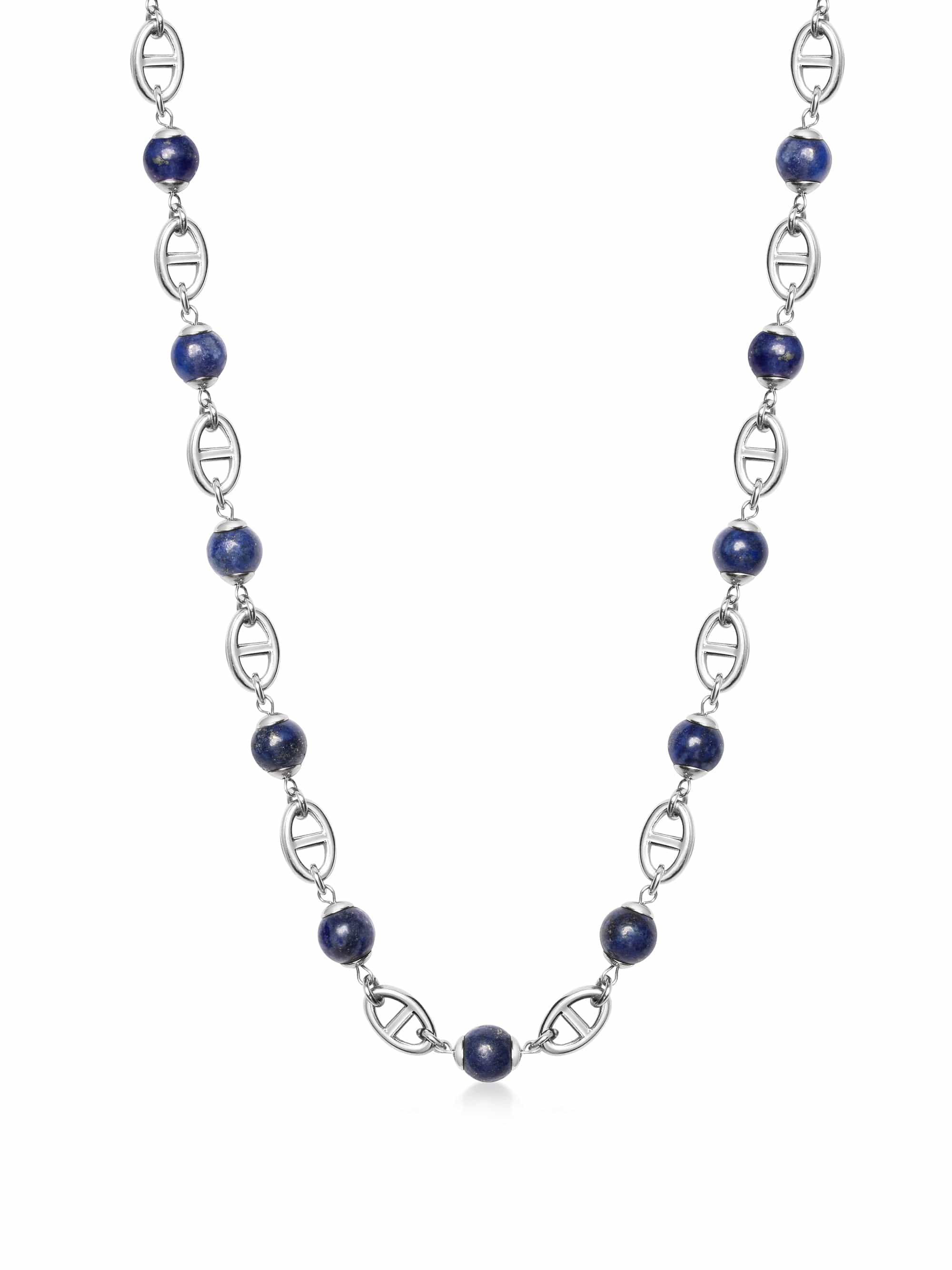 This Mariner chain, paired with blue Lapis Lazuli beads, makes for the perfect statement piece. It can be worn solo or layered with a second Lapis necklace for an edgy, fashionable look.