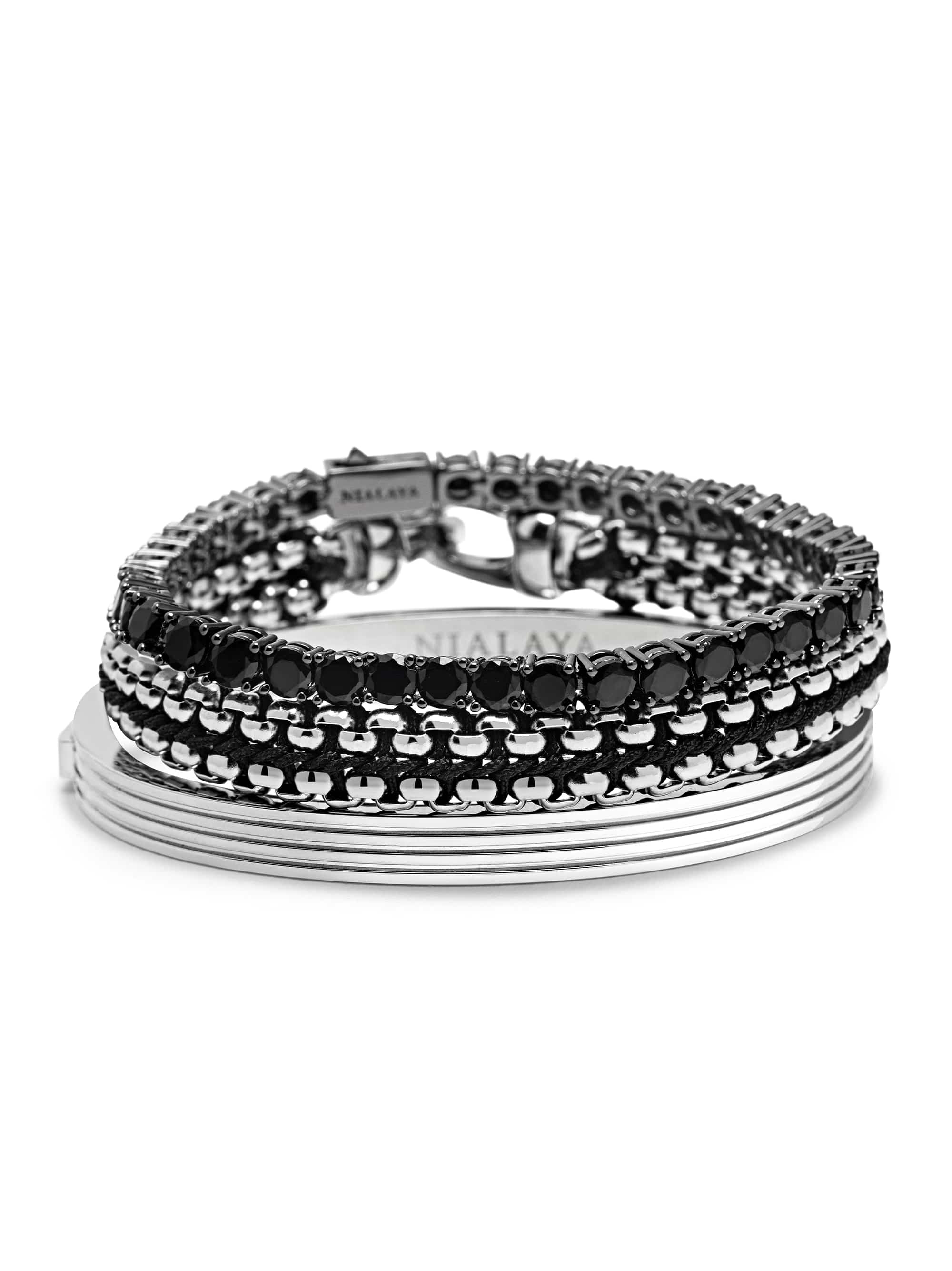 Bold yet refined, the April Stack is designed to make a statement through contrast and texture. Combining sleek metal elements with handwoven details and a row of deep black stones, it creates a layered look with depth and edge.