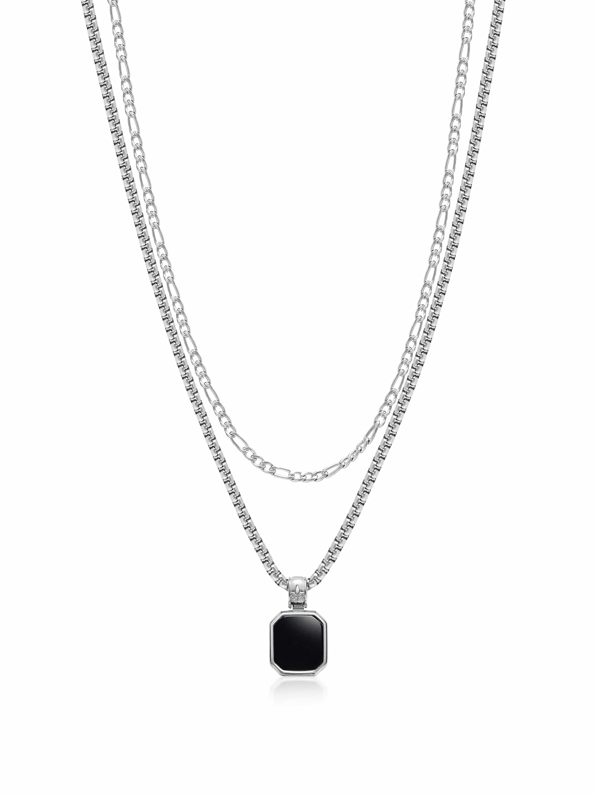 Ready-to-wear layers designed to make styling effortless. Discover the sleek elegance of silver with this striking combination: a classic Figaro chain paired with a square pendant necklace in stainless steel featuring a polished black onyx stone. Perfect for elevating any outfit, this layered set exudes timeless style. Please note, this necklace combination is not customizable.
