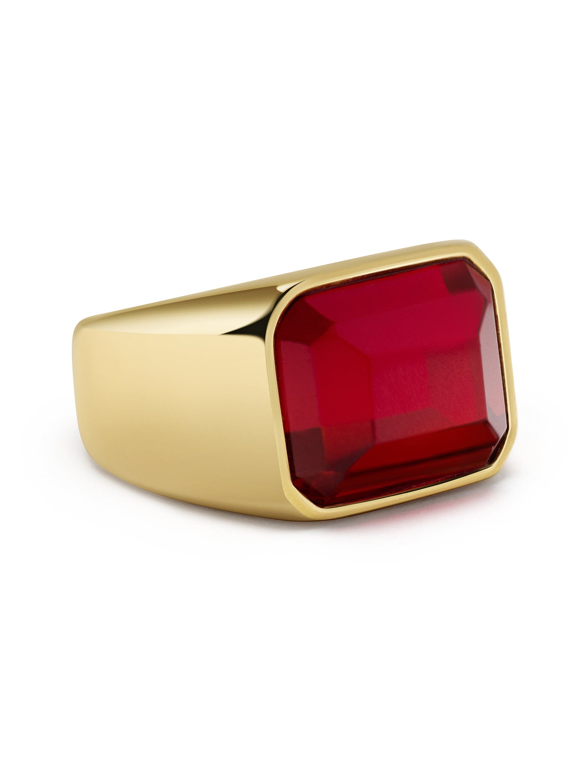 A bold take on a classic signet. The deep red zircon catches the light with a striking, glass-like shine, set in a smooth gold finish that feels both powerful and refined. The oversized stone gives the piece a confident presence, while the clean lines keep it modern and wearable.
