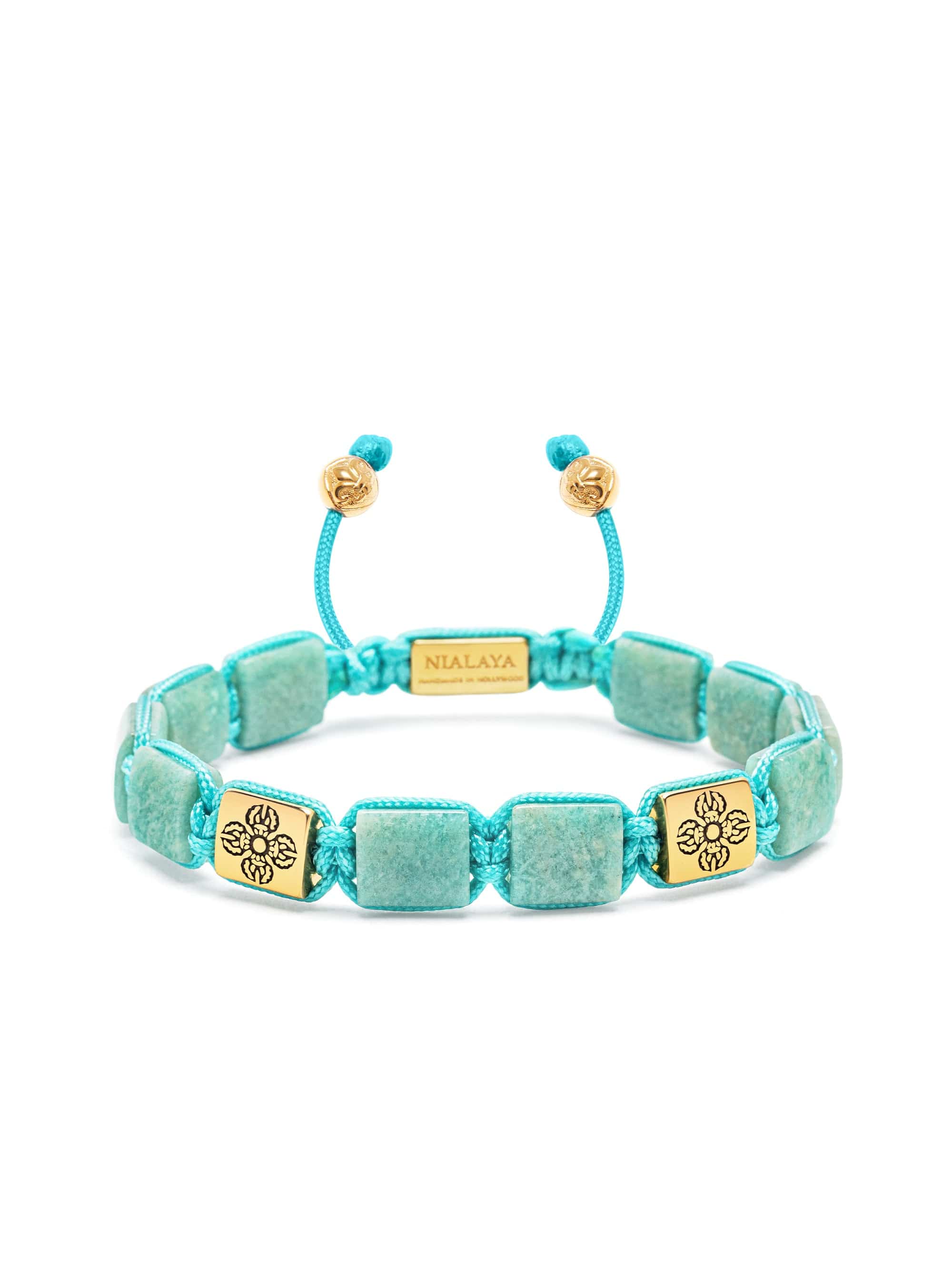 Part of The Dorje Flatbead Collection, this handcrafted bracelet pairs soothing amazonite beads with radiant gold accents for a look that is both refined and effortlessly elegant. The soft turquoise hues bring a fresh, luminous touch, making it a versatile piece to elevate any outfit. Wear it alone for subtle sophistication or layer it with a slimmer gold bracelet for a polished stacked look.