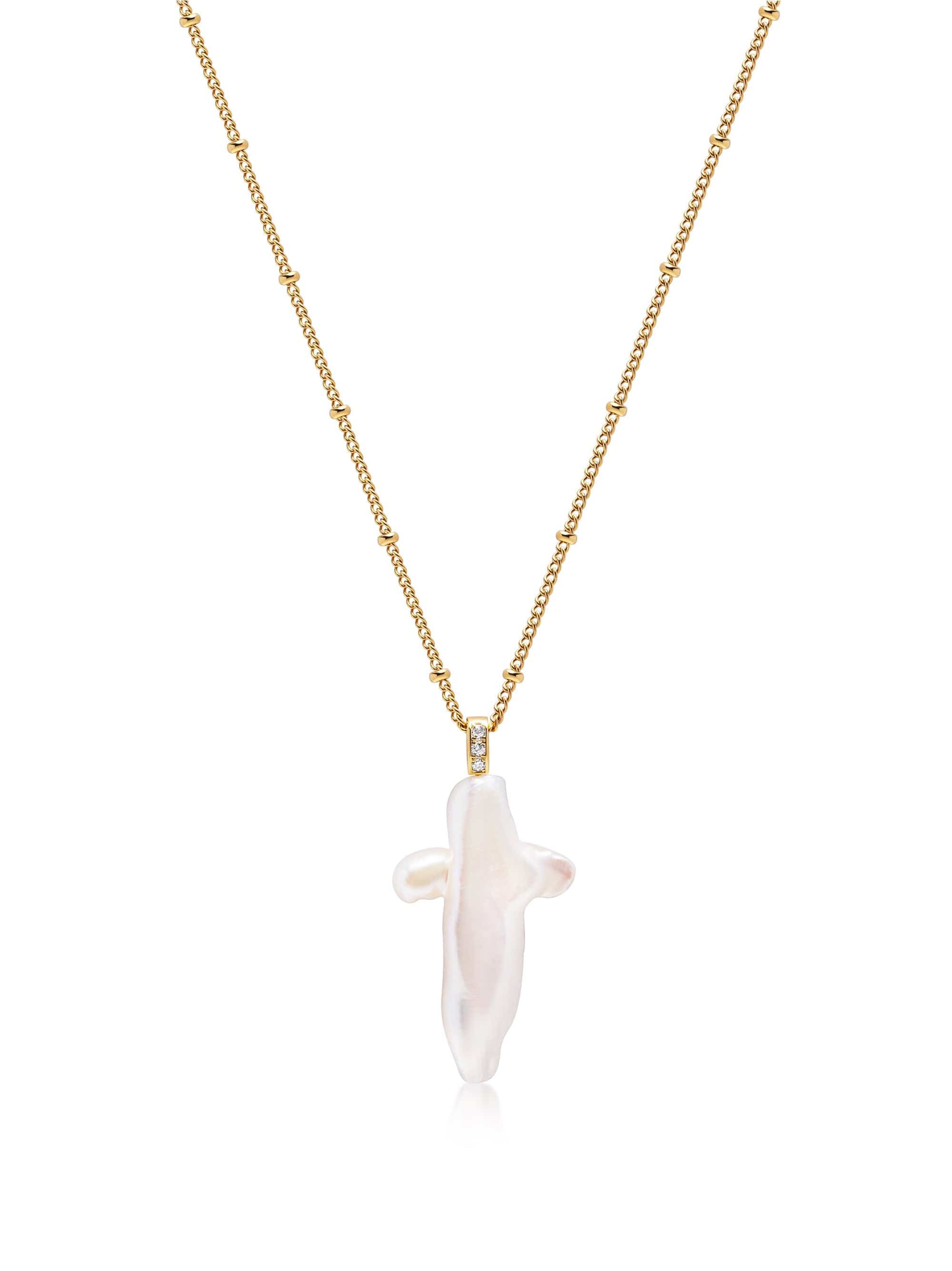 - Featuring a unique natural pearl formed in the shape of a cross as the centerpiece