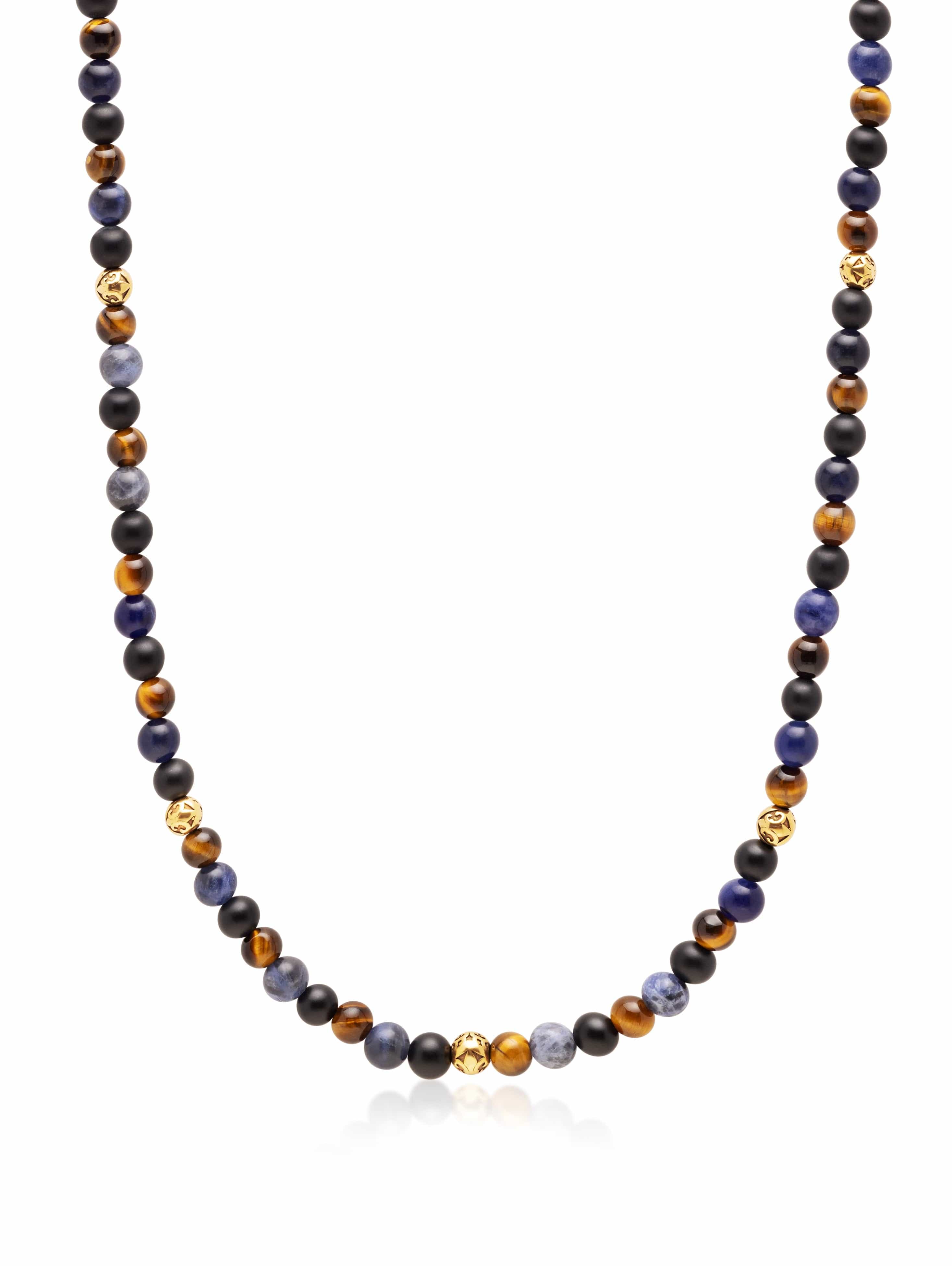 Beaded Necklace with Dumortierite, Brown Tiger Eye, and Gold