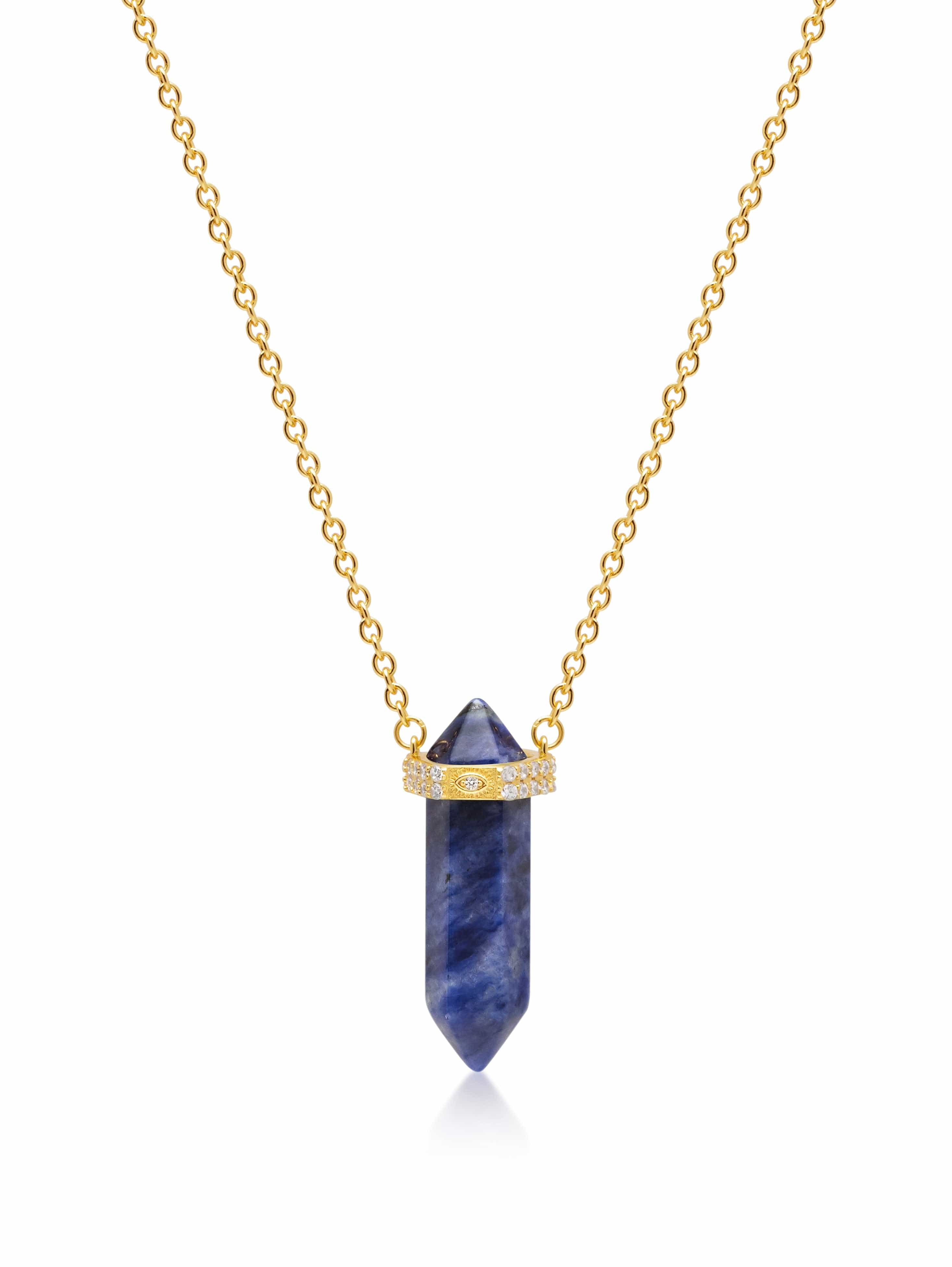 This stunning necklace features a hand-cut dumortierite crystal that is elegantly edged into a CZ-adorned sterling silver ring with a gold plating. A hand-carved evil eye in the center of the ring gives this piece a spiritual yet unique touch.
