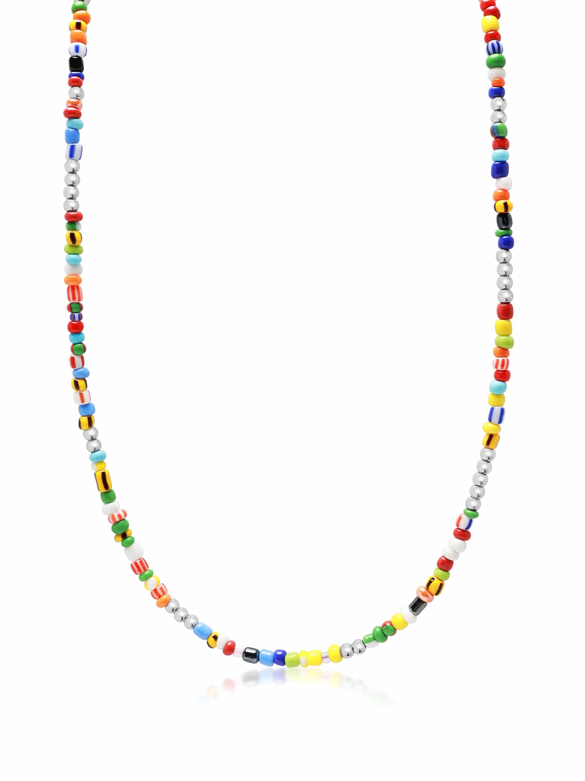Strung by hand in our LA studio from a curated selection of assorted vintage trifocal beads and silver accents, this men's necklace will add a distinctive touch to any outfit. Wear this versatile piece solo or layered with other chains for a bold, statement look. Each bead is carefully chosen for its unique character and quality, making this necklace a true standout in your collection.