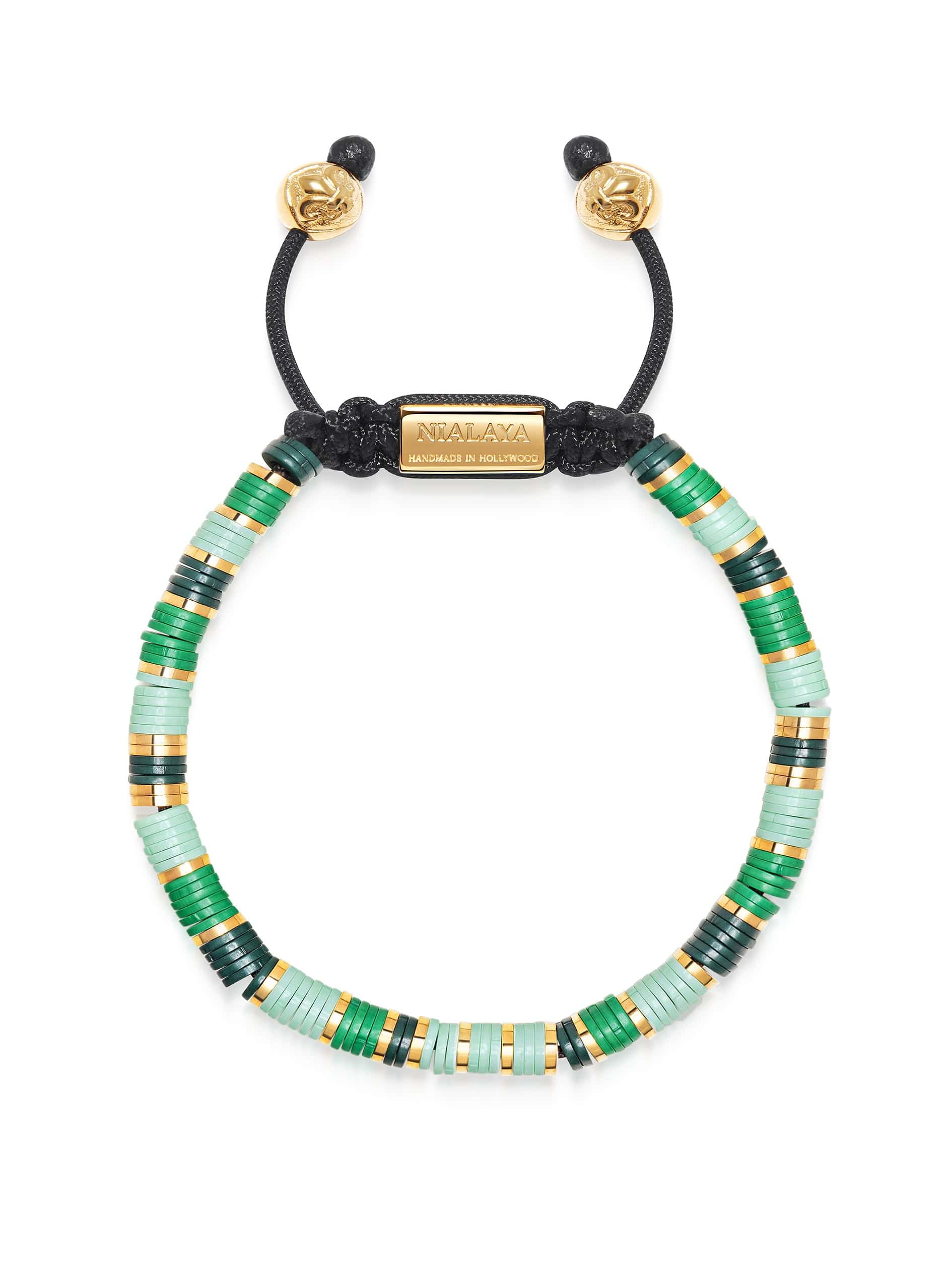 Men's Beaded Bracelet with Light Green and Gold Disc Beads