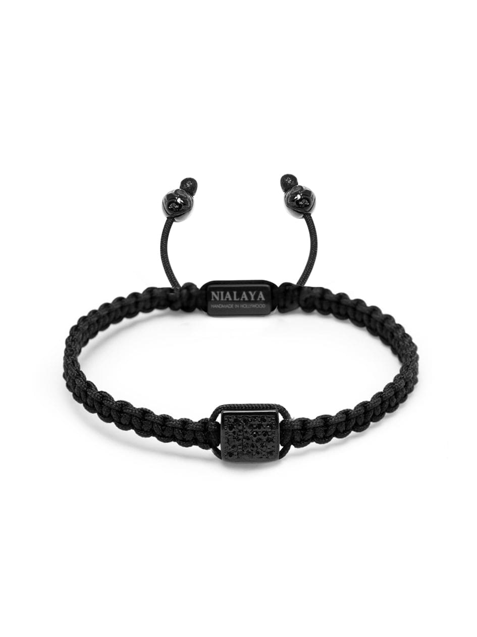 Hand-braided in our Los Angeles studio from a black nylon string and finished with a 10mm black plated flatbead, adorned with black CZ diamonds. Wear it by itself as a statement, or layered with beaded bracelets.