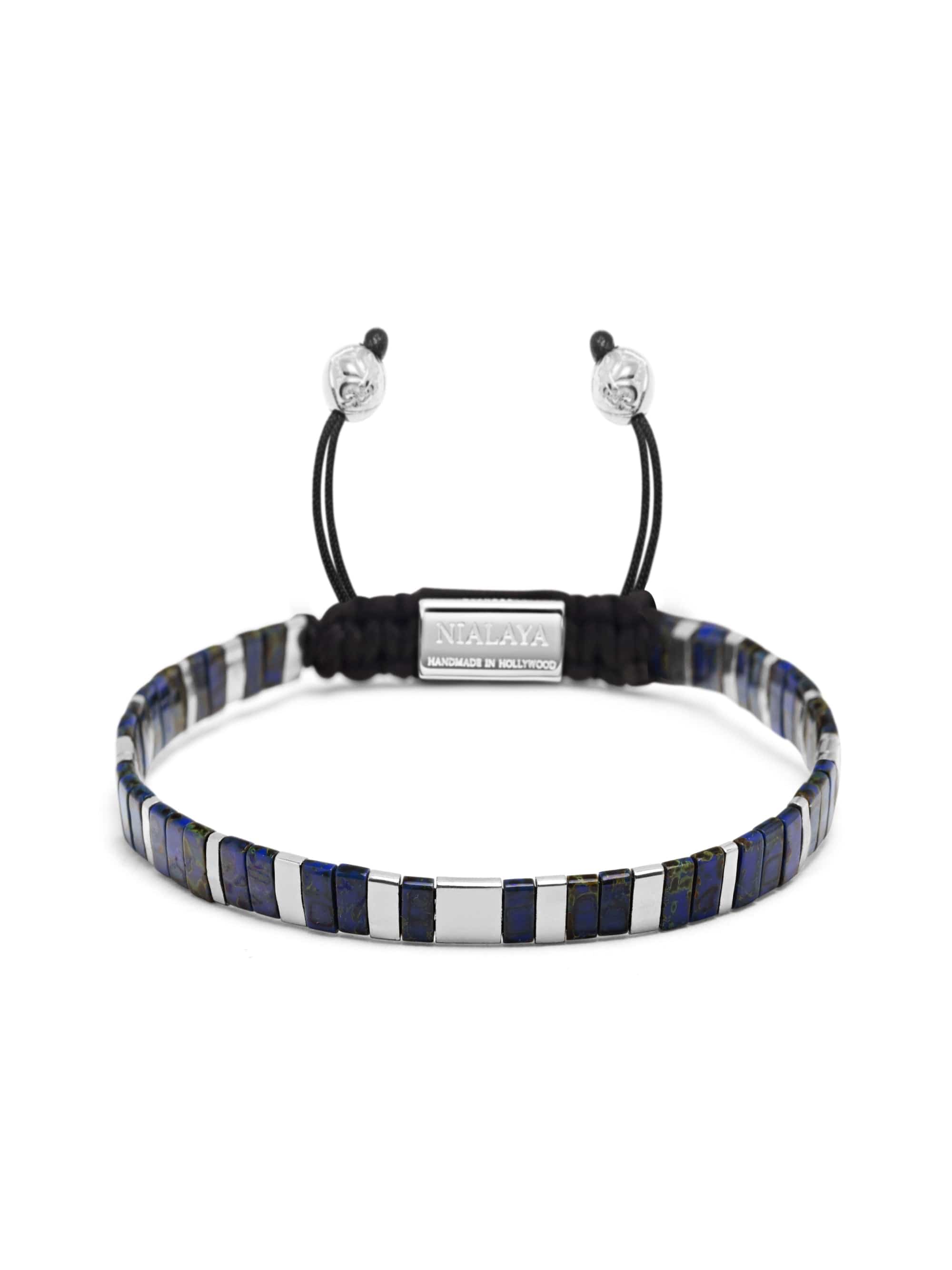 The deep blue tones evoke a sense of calm and serenity, while the shimmering silver accents add a touch of modern glamour. Whether you're attending a special event or seeking a daily dose of refinement, this bracelet effortlessly transitions from day to night. Embrace the unique combination of colors and craftsmanship as you adorn your wrist with a piece that speaks to your individuality.
