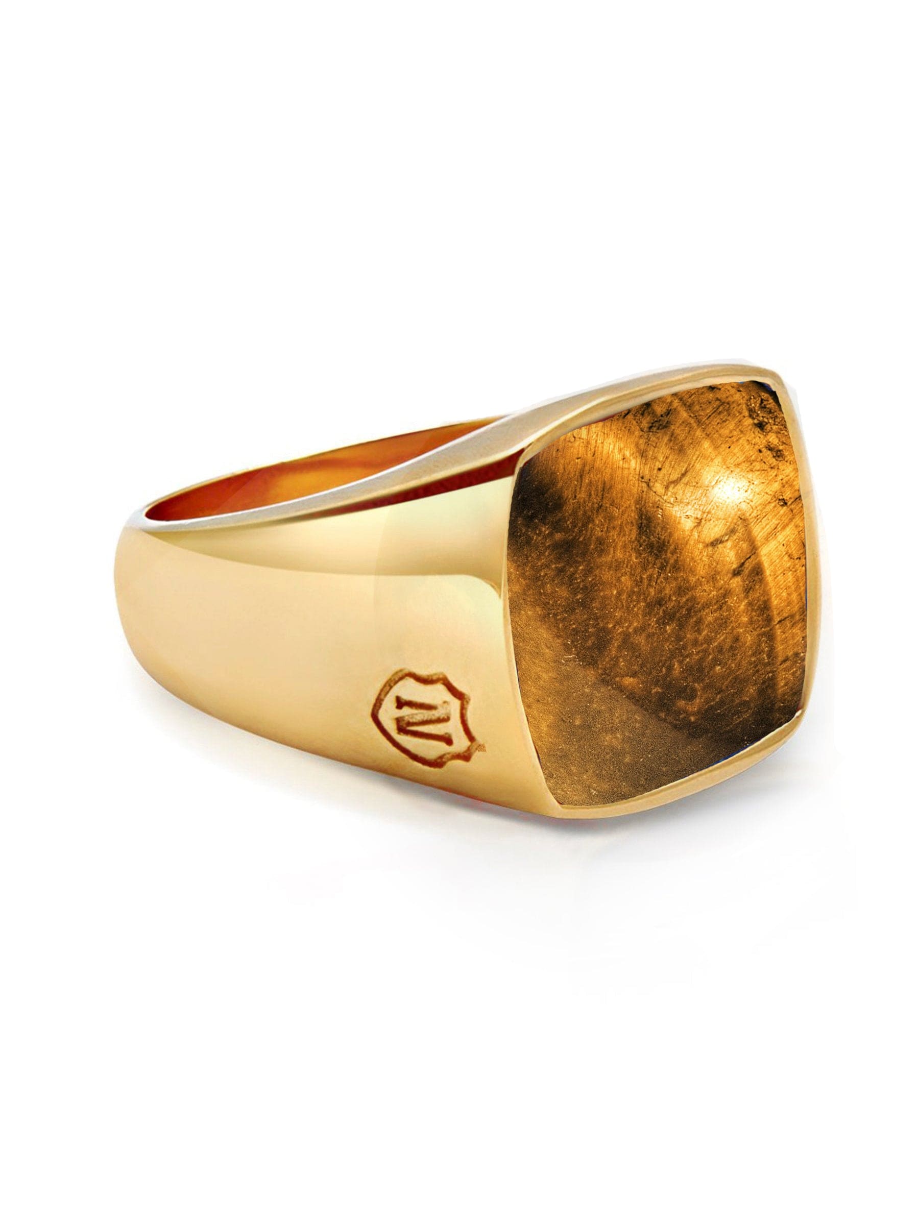 The Men's Gold Signet Ring is designed with a contemporary style. The focal point of the ring is the rich Brown Tiger Eye stone, which sits at the center of its gold-finished band, exuding warmth and sophistication.
