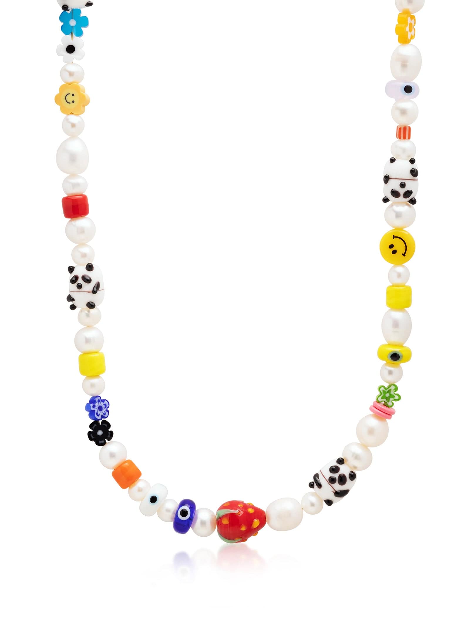 Strung by hand in our LA studio from beautiful baroque freshwater pearls and assorted glass beads, this necklace will add a unique touch to all your looks. Wear this stunning piece solo or layered. Celebrities like Shawn Mendes, Addison Rae, and Maluma love and wear this style daily. We use cultured pearls from oysters and freshwater mussels that we select by hand for all our jewelry.