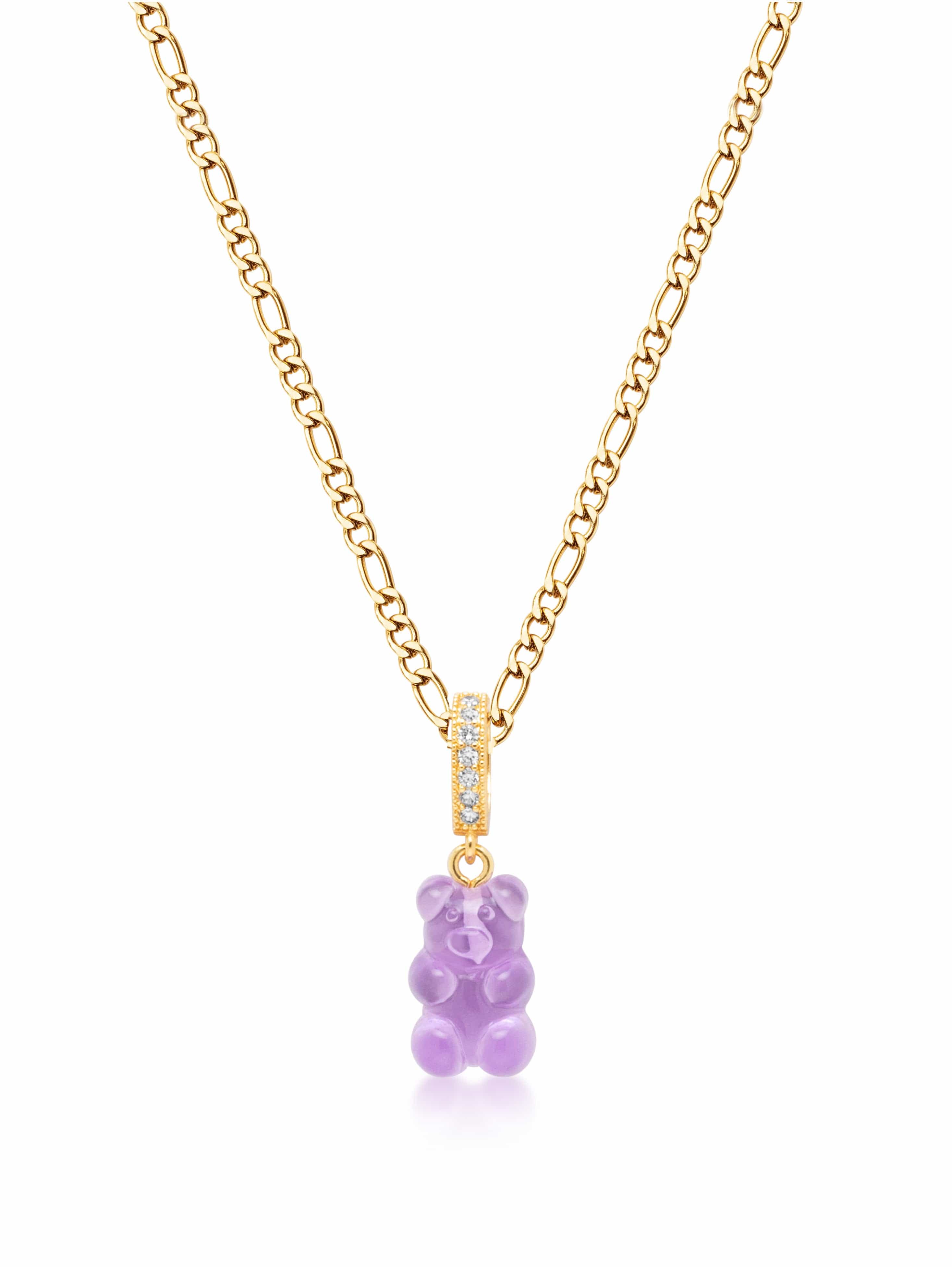 Crafted by hand with meticulous attention to detail, this edgy necklace features purple teddy bear pendant on a thin figaro chain. Wear it layered with other chains to complete your look.