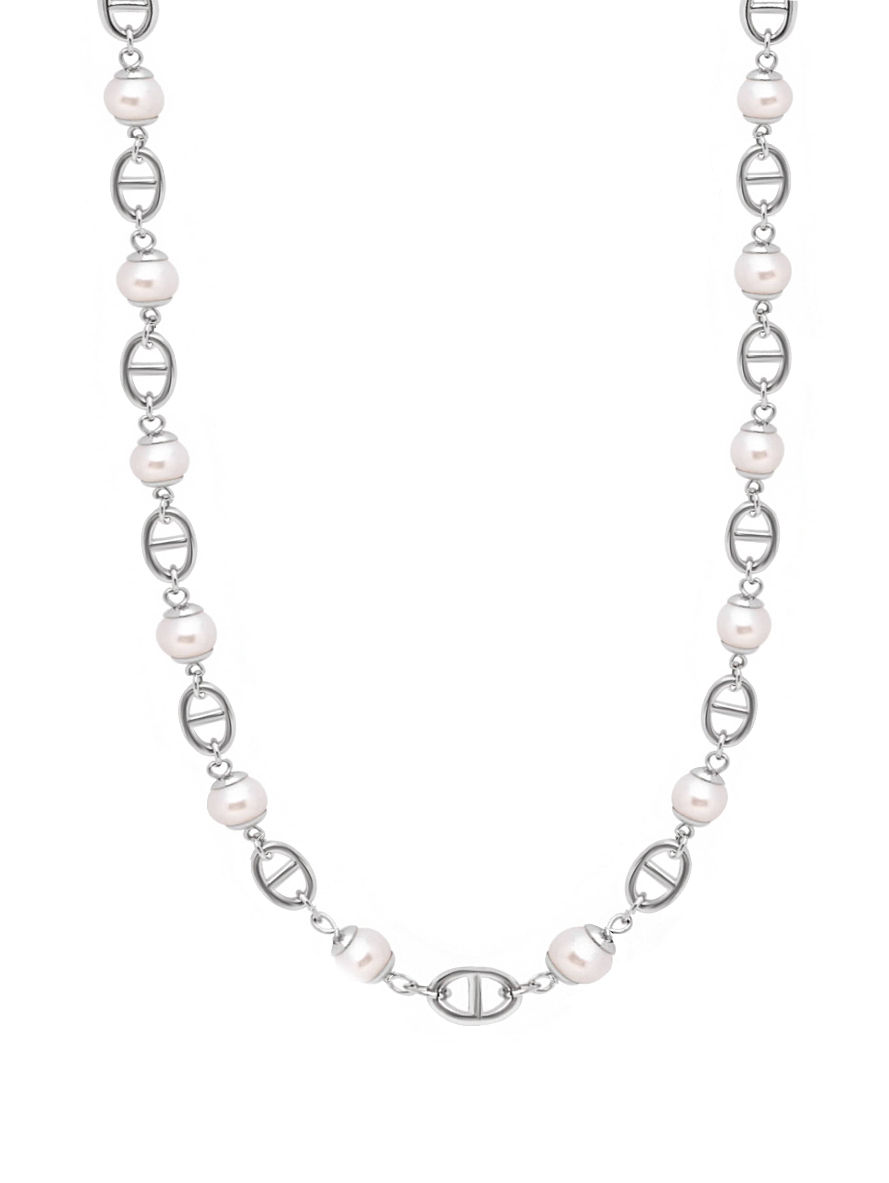 This Mariner chain, paired with freshwater pearls makes for the perfect statement piece. It can be work solo or layered with a second pearl necklace for an edgy, fashionable look.