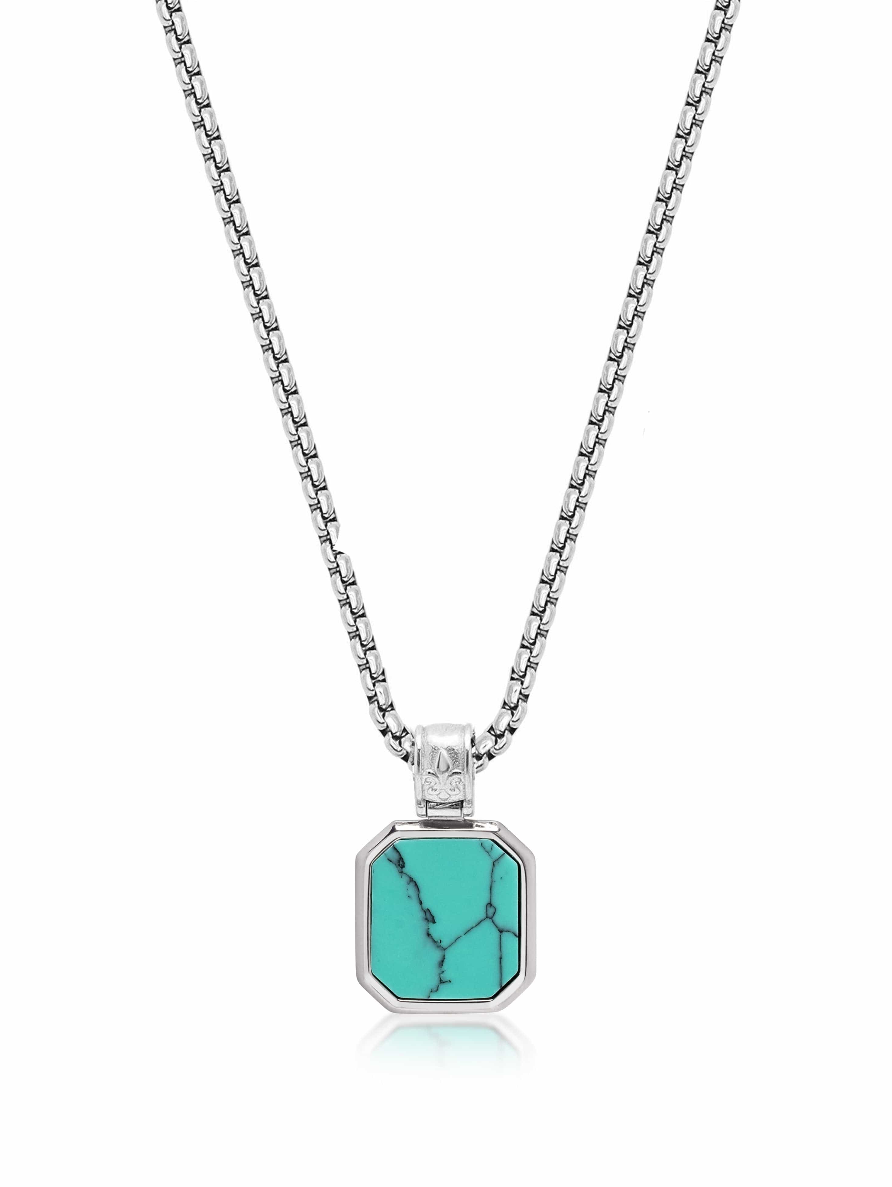 Inspired by the lighter and brighter palette of the natural waters around the world, this modern necklace features a brilliant Turquoise, giving the wearer personal strength, protection from harm, psychic sensitivity, and connection to the spirit world. This piece was forged with stainless steel and finished with radiant silver, with the square pendant giving the overall piece a nice clean touch.