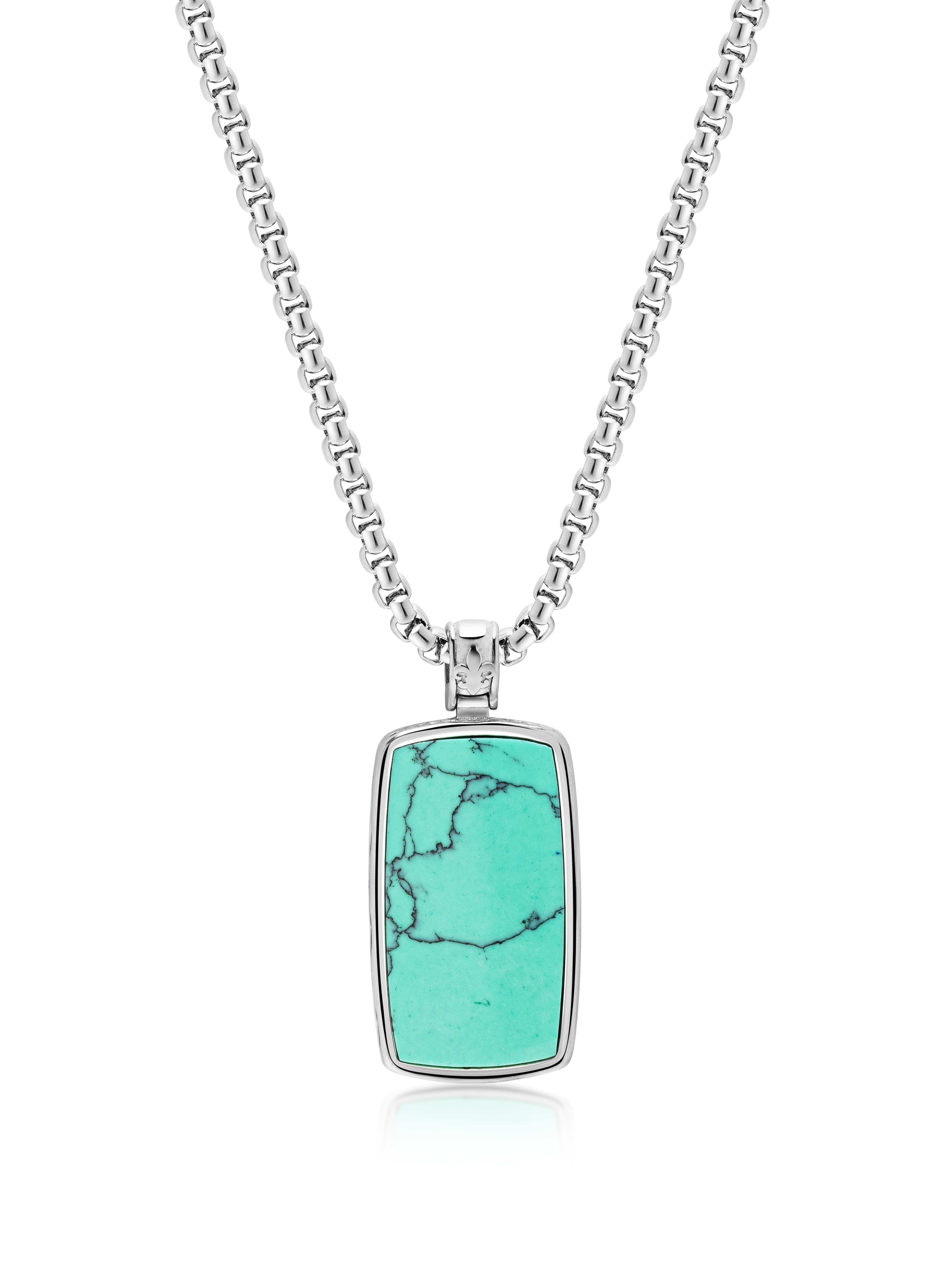 Striking and timeless, the Turquoise Dog Tag Necklace in Silver blends bold design with natural beauty. Featuring a vibrant turquoise stone set within a sleek dog tag silhouette, it brings a fresh pop of color balanced by clean, polished silver.