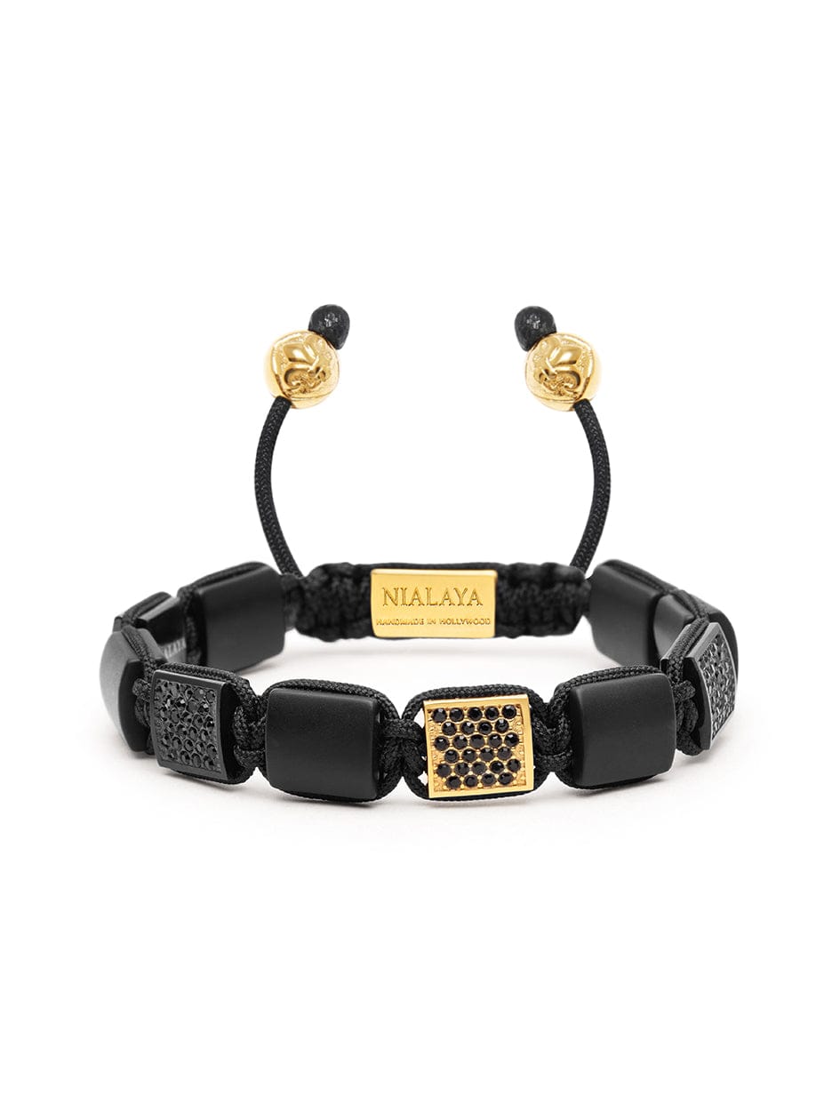 Women's Black Onyx Flatbead Bracelet with Black CZ Diamonds and Gold Plating