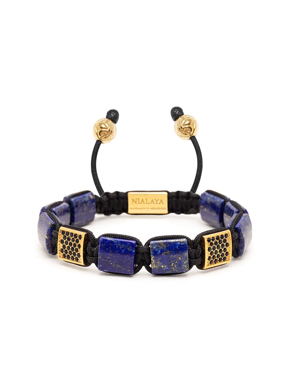 Women's Blue Lapis Flatbead Bracelet with Black CZ Diamonds and Gold Plating